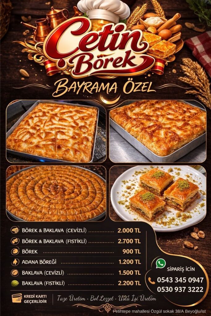Çetin Börek olarak su böreği ve baklava üretiminde müşteri memnuniyetini esas alıyor, siparişlerinizi hızlı ve güvenli şekilde hazırlıyoruz. Toptan siparişleriniz ve özel üretim talepleriniz için bizimle iletişime geçebilirsiniz.